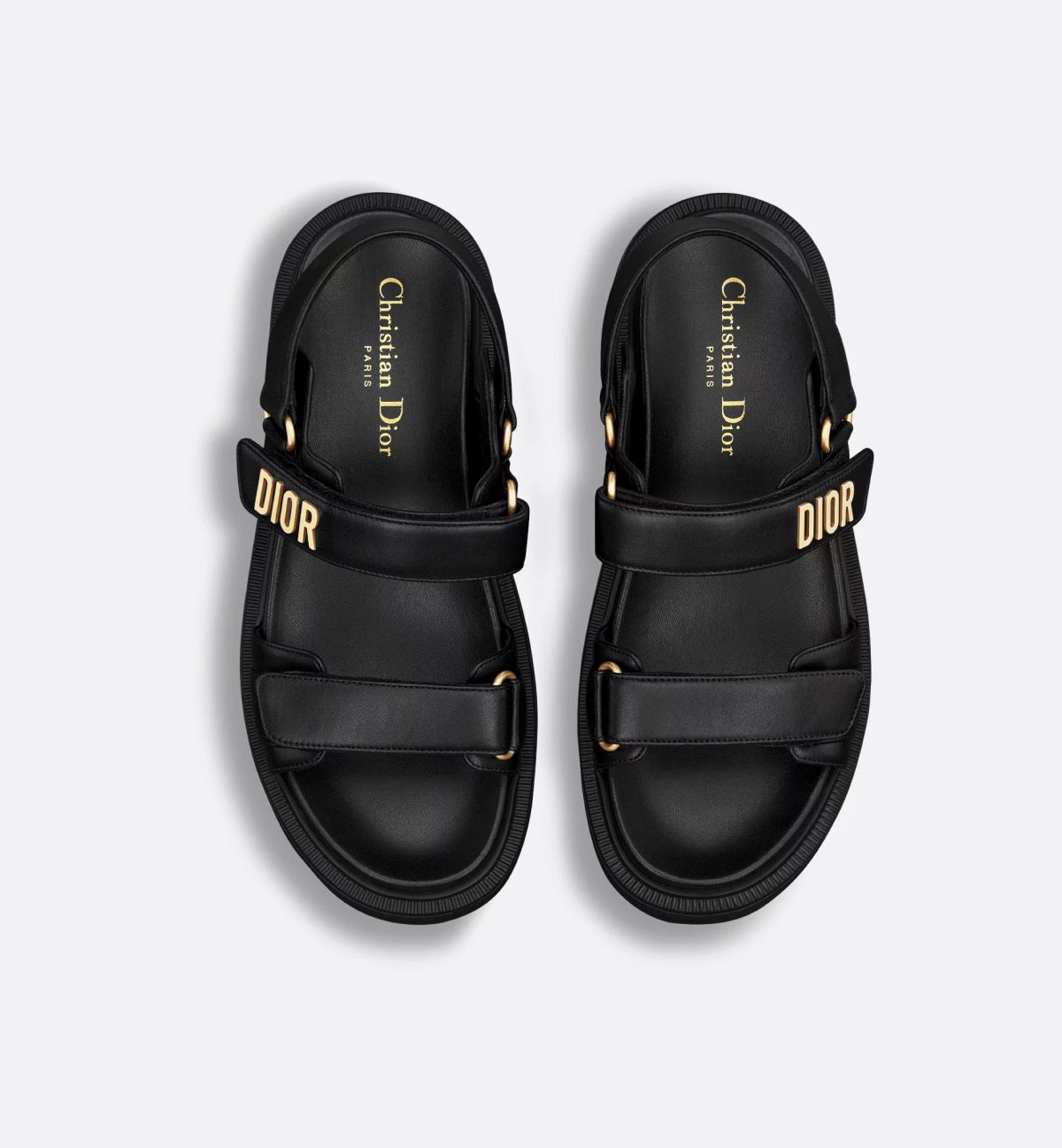 The Dioract sandal is recast into a modern platform. The anatomically shaped insole offers lightweight comfort. Crafted in black lambskin, it features self-fastening straps enhanced by a gold-finish metal Dior signature on the upper strap. The sandal will lend a contemporary touch to any look.