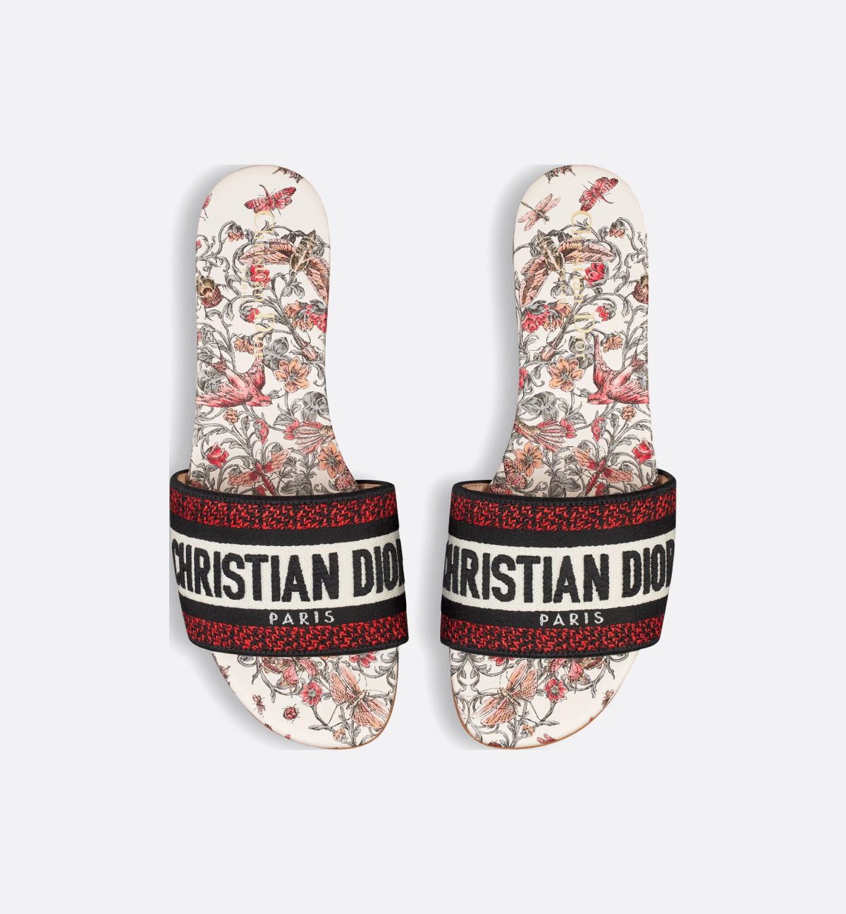 Part of the Dioramour capsule celebrating Dior's vision of love and romance, the Dway slide is a hallmark and timeless style featuring Pietro Ruffo's multicolor Cœur des Curiosités motif showcasing a floral design elevated by symbols like the bee, butterfly and swallow. The white upper is embroidered with the Christian Dior Paris signature for an instantly recognizable touch, while the minimalist silhouette will slip on easily to complete a laid-back outfit. The shoe can be paired with other creations from the Dioramour capsule.