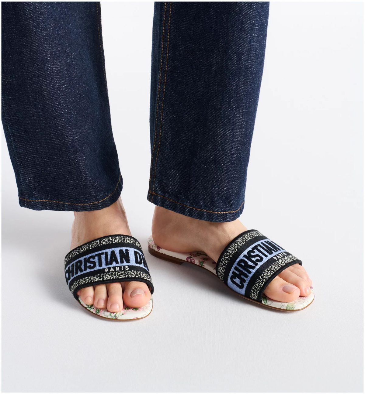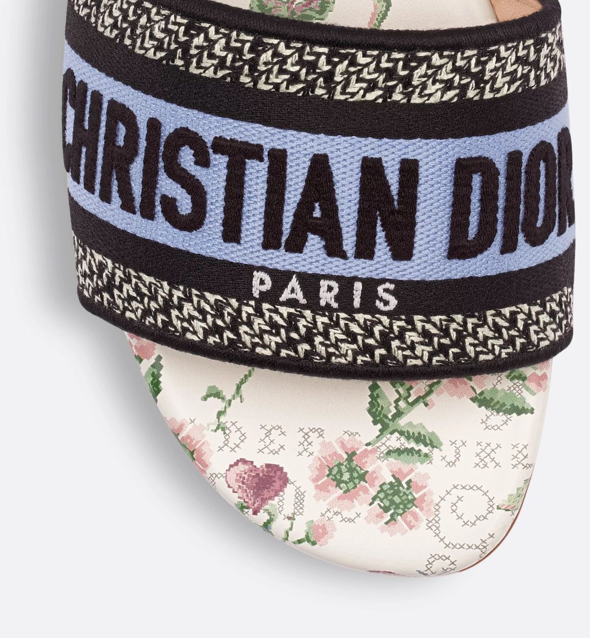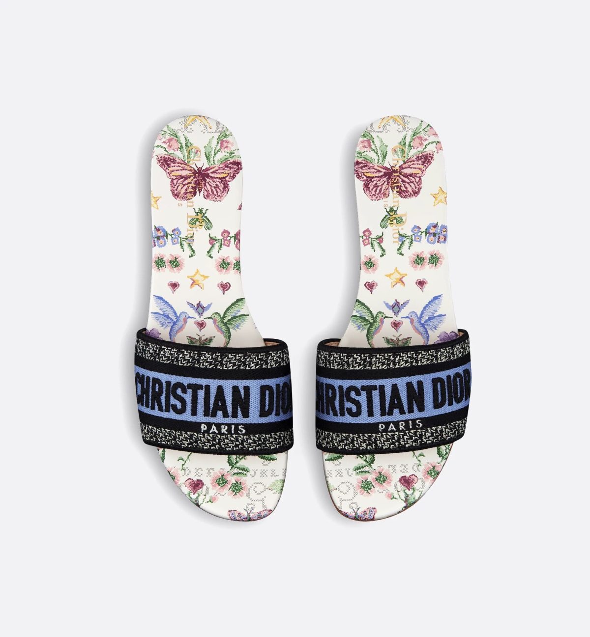 Part of the Dioramour capsule celebrating Dior's vision of love and romance, the Dway slide is a hallmark and timeless style showcasing the white multicolor Amour 1947 motif, featuring an idyllic heart embellished with House symbols and codes dear to Mr. Dior and accented by the retro aesthetic of the cross-stitch effect. The blue upper is embroidered with the Christian Dior Paris signature for an instantly recognizable touch, while the minimalist silhouette will slip on easily to complete a laid-back outfit. The shoe can be paired with other creations from the Dioramour capsule.