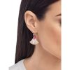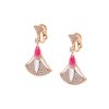 The Divas' Dream 18K rose gold necklace is a subtle interpretation of joyful femininity, with a colorful design that interprets the iconic fan pattern. The signature aesthetic of this series is embellished with pavé diamonds and mother-of-pearl inlays, which are carefully cut to fit the intricate design, and two pear-shaped red tourmalines are elegantly embellished on the gemstone mosaic pattern, which fully reflects Bvlgari's heritage of Roman culture. Divas' Dream 18K rose gold earrings, inlaid with pear-shaped red tourmalines and mother-of-pearl, with pavé diamonds.