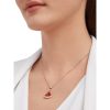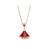 The Divas’ Dream necklace embodies Italian elegance and unleashes feminine power with a mysterious and unforgettable temperament. The charming and exquisite pendant is decorated with a fan-shaped pattern, inspired by the mosaic decoration of the Caracalla Baths in Rome, and highlights the historical origins of Bvlgari and the “Eternal City” Rome with a modern and fashionable design and a combination of exquisite gemstones. Divas’ Dream necklace in 18K rose gold, set with carnelian and a round brilliant-cut diamond, decorated with pavé diamonds.