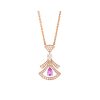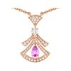 The Divas' Dream necklace in 18K rose gold is a subtle expression of joyful femininity, with a colorful design that interprets the iconic fan motif. The signature aesthetic of the collection is presented in a diamond-set hollow pendant with a pear-shaped pink sapphire in the center, reflecting Bvlgari's Roman heritage. This timeless and elegant piece celebrates the beauty of nature and is created to celebrate Chinese Valentine's Day. Divas' Dream necklace in 18K rose gold, set with a pear-shaped pink sapphire and brilliant-cut diamonds. Due to the handmade nature of the work, the size and weight of the jewelry pieces are for reference only.
