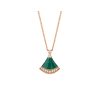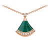 The Divas' Dream necklace in 18K rose gold is a subtle expression of joyful femininity, with a colorful design that interprets the iconic fan pattern. The signature aesthetic of the collection is presented through a delicate pendant, which is cleverly set with a green malachite and embellished with pavé diamonds, reflecting Bvlgari's Roman heritage. This piece is elegant and timeless, celebrating the beauty of nature. Divas' Dream pendant necklace in 18K rose gold, set with malachite and embellished with pavé diamonds. Due to the handmade nature of the work, the size and weight of the jewelry pieces are for reference only.