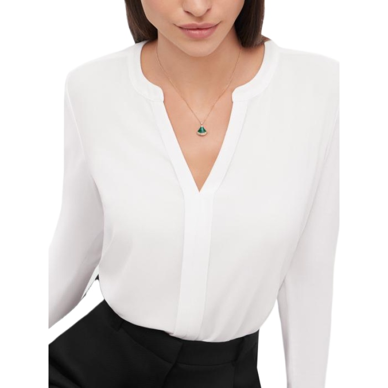 The Divas' Dream necklace in 18K rose gold is a subtle expression of joyful femininity, with a colorful design that interprets the iconic fan pattern. The signature aesthetic of the collection is presented through a delicate pendant, which is cleverly set with a green malachite and embellished with pavé diamonds, reflecting Bvlgari's Roman heritage. This piece is elegant and timeless, celebrating the beauty of nature. Divas' Dream pendant necklace in 18K rose gold, set with malachite and embellished with pavé diamonds. Due to the handmade nature of the work, the size and weight of the jewelry pieces are for reference only.