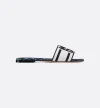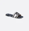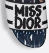The Dway slide is a timeless style showcasing the collection's hallmark deep blue Miss Dior Allover motif, inspired by the Marc Bohan for Dior archives in a modern take on the 1960s. The white cotton upper is embroidered with the black Miss Dior Graffiti signature. The sleek design slips on easily for a laid-back style. The shoe can be paired with other Miss Dior Allover creations.