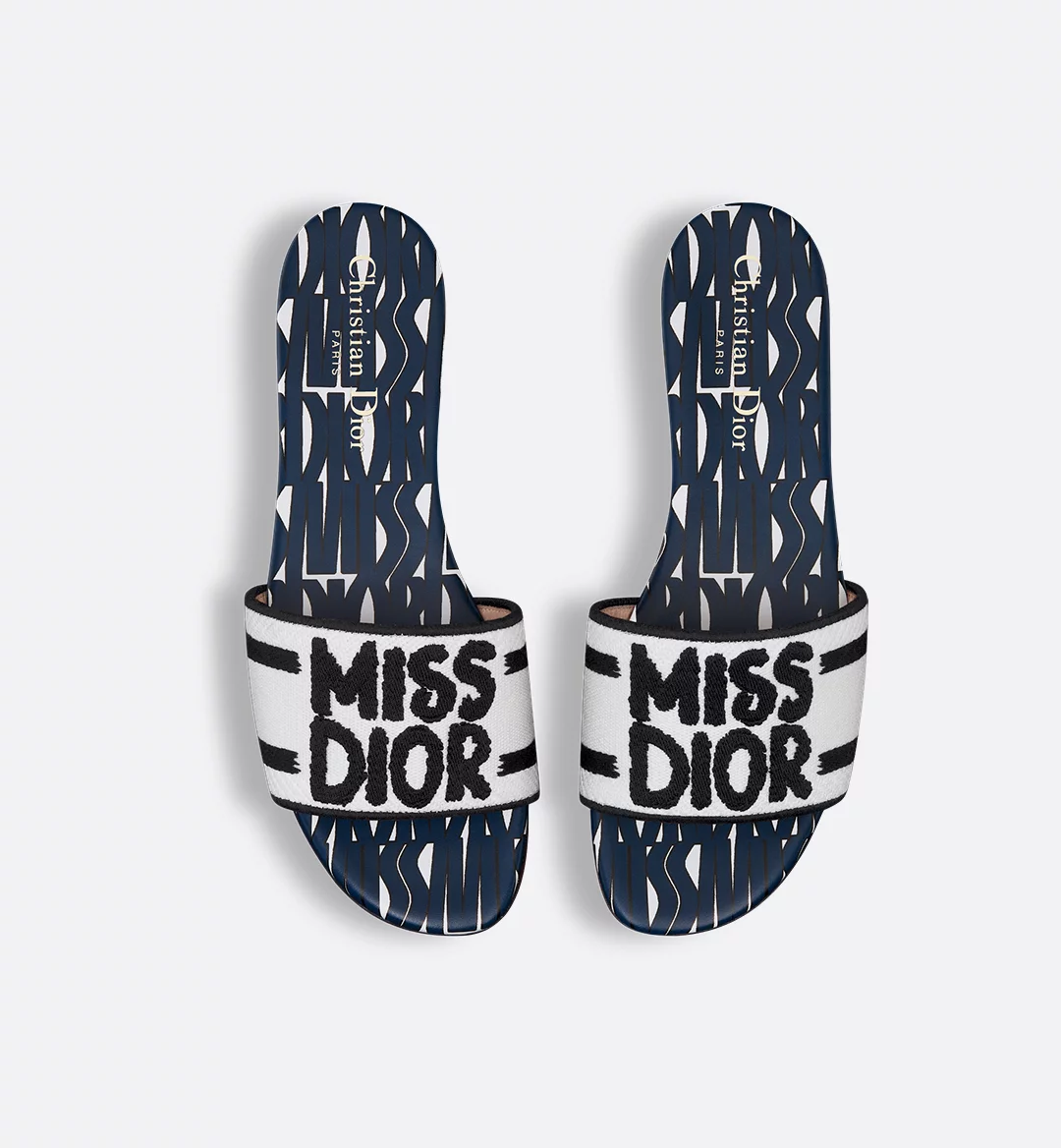 The Dway slide is a timeless style showcasing the collection's hallmark deep blue Miss Dior Allover motif, inspired by the Marc Bohan for Dior archives in a modern take on the 1960s. The white cotton upper is embroidered with the black Miss Dior Graffiti signature. The sleek design slips on easily for a laid-back style. The shoe can be paired with other Miss Dior Allover creations.