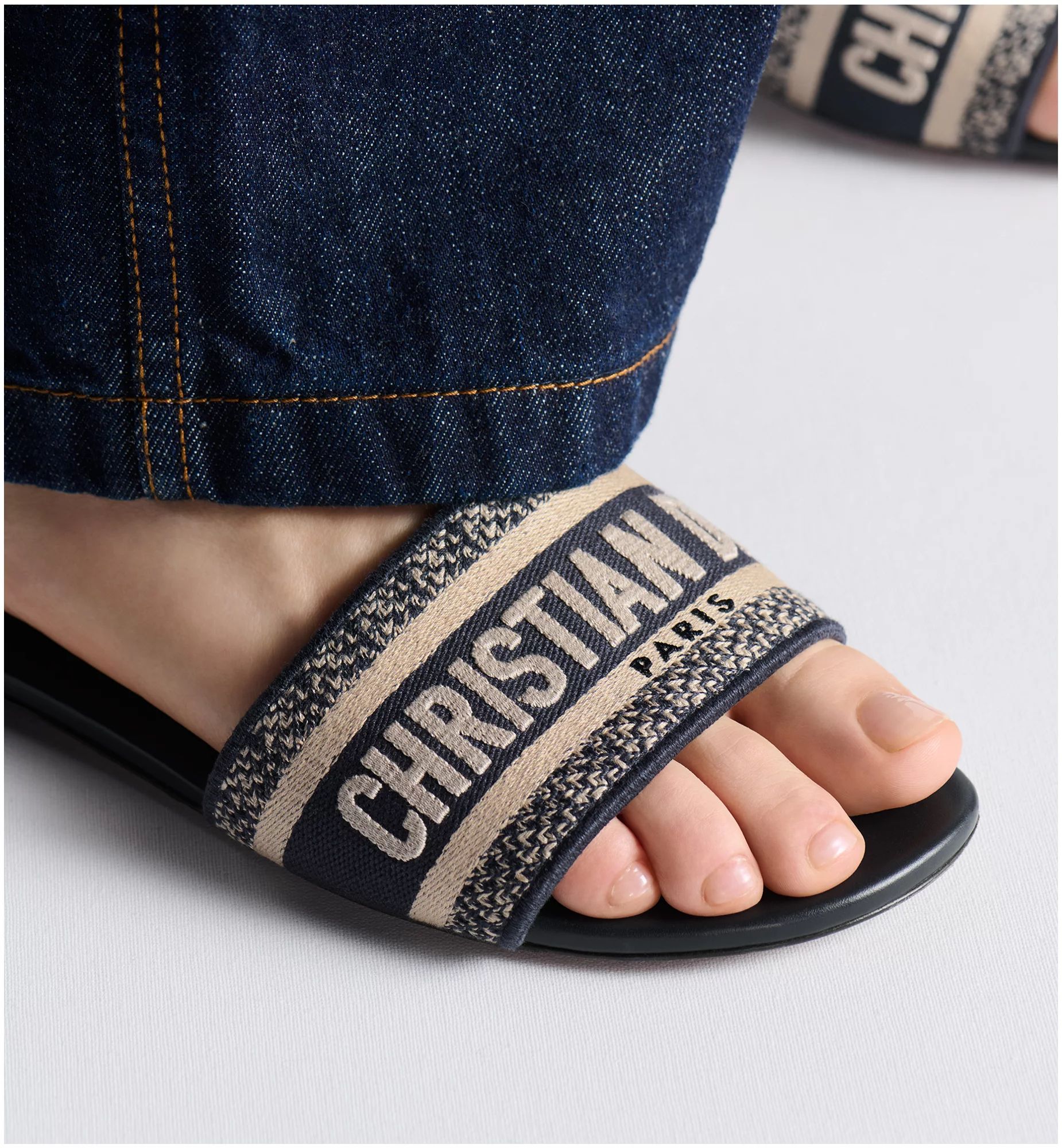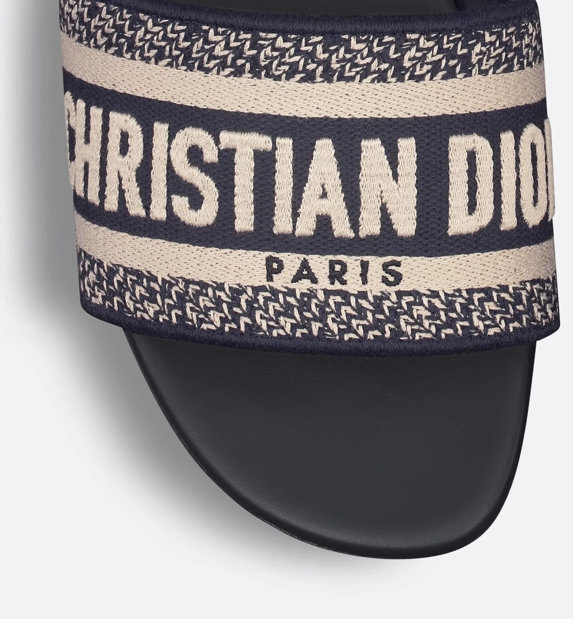 The Dway slide has a timeless and emblematic silhouette. The slide's upper features a deep blue embroidered Christian Dior Paris signature for an unmistakable touch. The streamlined design slips on easily and offers effortless style.