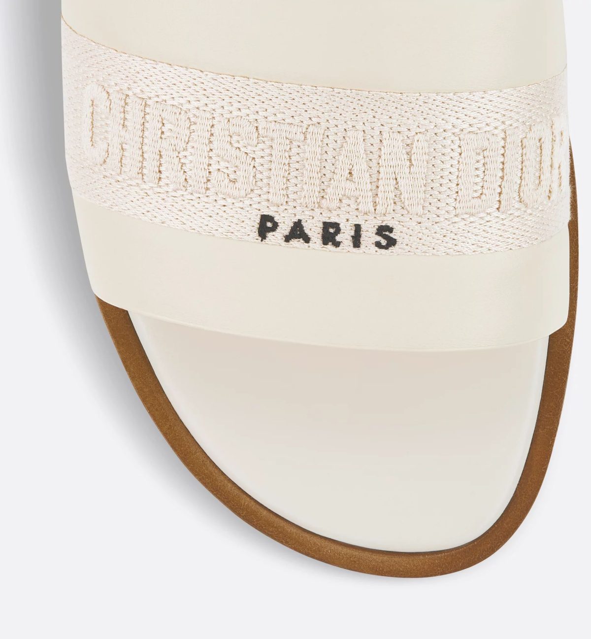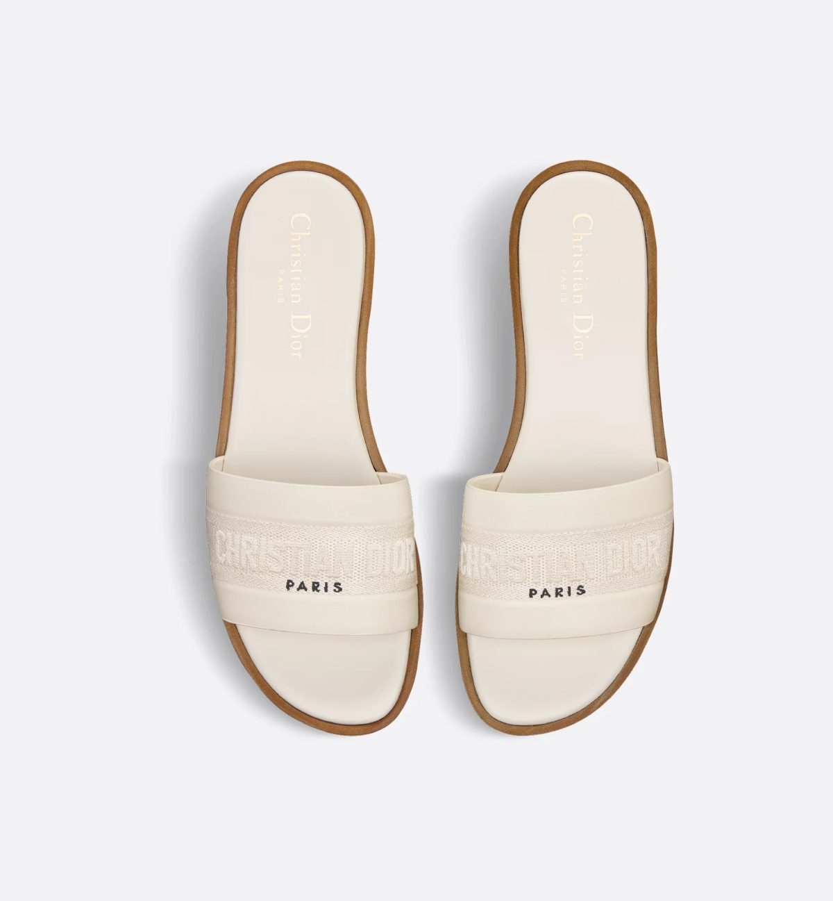 The Dway slide revisits a timeless and emblematic silhouette. The upper in white calfskin and cotton embroidered with the Christian Dior Paris signature instantly stands out, while the padded leather insole offers ultimate comfort. Its streamlined design allows it to be easily slipped on to complete a laid-back outfit.