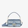 Iconic medium Baguette bag, created in 1997 which went on to become the leading It bag. Versatile and with timeless appeal, it features the iconic underarm design inspired by the French Baguette bread from which it takes its name. Hand-embroidered with light blue sequins of different shapes and sizes with a denim-effect finish. Trimmed in light blue calfskin and embellished with an FF clasp. Featuring a front flap, magnetic clasp, satin-lined internal compartment with a zip pocket and gold-finish metalware. The bag can be carried by hand, or worn either on the shoulder or cross-body thanks to the handle and shoulder strap, both detachable. Made in Italy