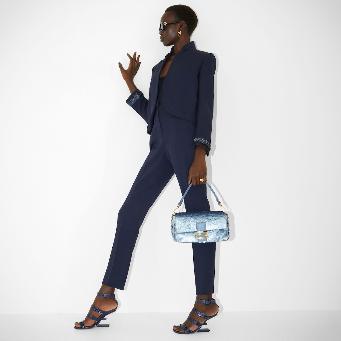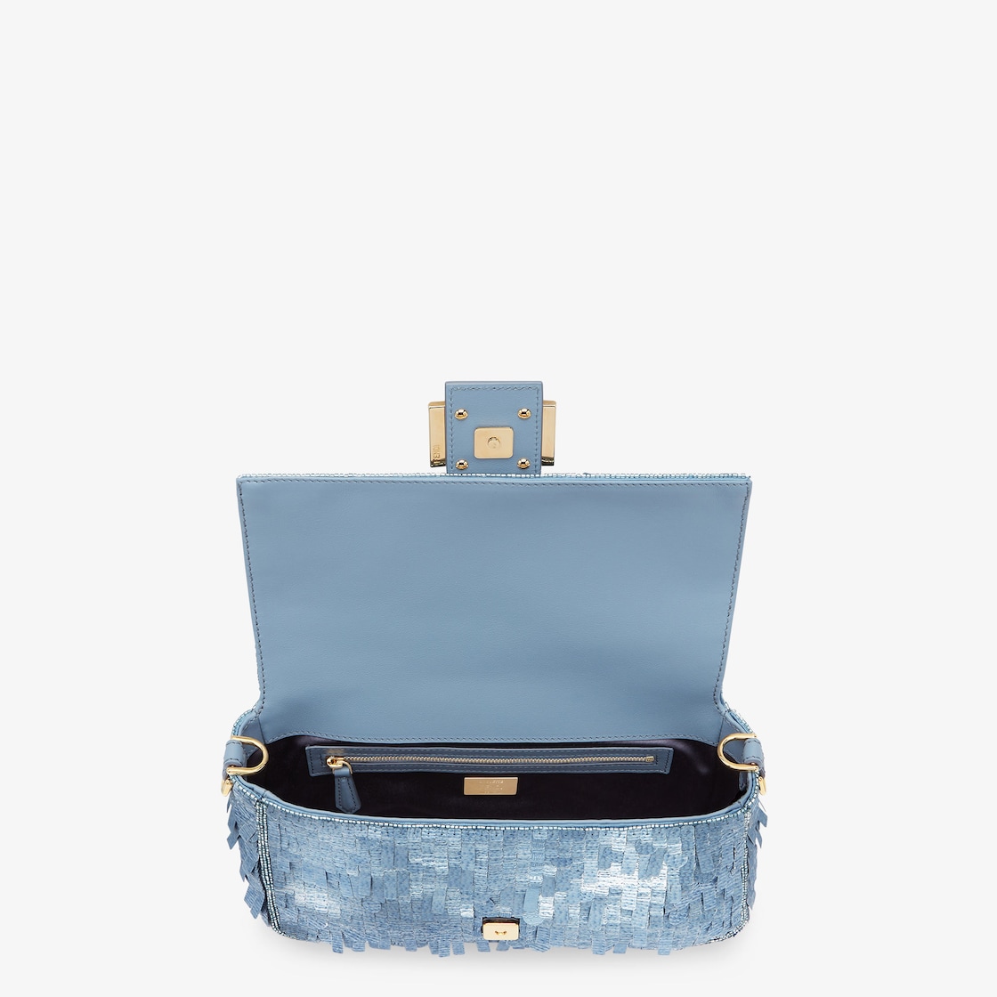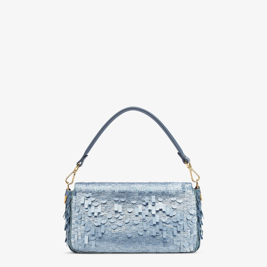 Iconic medium Baguette bag, created in 1997 which went on to become the leading It bag. Versatile and with timeless appeal, it features the iconic underarm design inspired by the French Baguette bread from which it takes its name. Hand-embroidered with light blue sequins of different shapes and sizes with a denim-effect finish. Trimmed in light blue calfskin and embellished with an FF clasp. Featuring a front flap, magnetic clasp, satin-lined internal compartment with a zip pocket and gold-finish metalware. The bag can be carried by hand, or worn either on the shoulder or cross-body thanks to the handle and shoulder strap, both detachable. Made in Italy