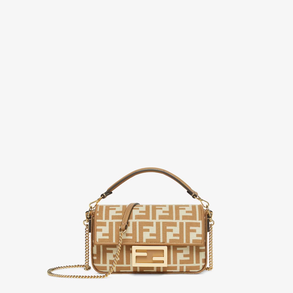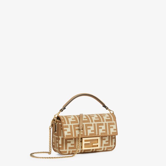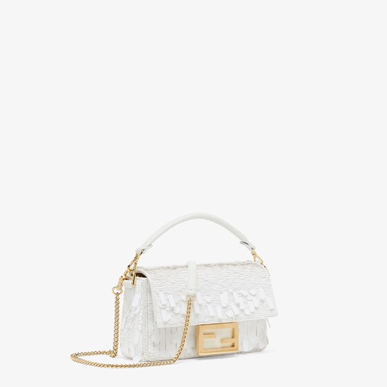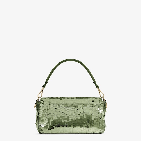 Iconic medium Baguette bag, created in 1997 which went on to become the leading It bag. Versatile and with timeless appeal, it features the iconic underarm design inspired by the French Baguette bread from which it takes its name. Hand-embroidered with green sequins of different shapes and sizes. Embellished with tone on tone calfskin details and decorated with an FF clasp. Featuring a front flap, magnetic clasp, brown satin-lined internal compartment with a zipper pocket and gold-finish metalware. The bag can be carried by hand, or worn either on the shoulder or cross-body thanks to the handle and shoulder strap, both detachable. Made in Italy