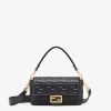 Iconic medium Baguette bag, created in 1997 which went on to become the leading It bag. Versatile and with timeless appeal, it features the iconic underarm design inspired by the French Baguette bread from which it takes its name. Made of a particularly soft and hard-wearing, black calfskin with a 3D-effect, embossed iconic FF motif. Decorated with an FF clasp. Featuring a front flap embellished with debossed FENDI lettering, magnetic clasp, tone-on-tone nappa leather-lined internal compartment with a zip pocket and gold-finish metalware. The bag can be carried by hand or worn either on the shoulder or cross-body for comfort, thanks to the handle and shoulder strap, both detachable. Made in Italy