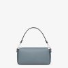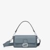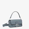 Medium iconic Baguette bag, made with 612 tone-on-tone macro topstitches, an emblem of the iconic Selleria workmanship. Made of blue Cuoio Romano leather, calfskin with a characteristic natural grain, produced with a metal-free tanning process. Featuring a front flap, magnetic clasp, internal calfskin-lined compartment, internal zip pocket, silver Selleria plate, palladium-finish metalware. Decorated with an FF clasp. The bag can be carried by hand or worn on the shoulder thanks to the handle and shoulder strap, both detachable.