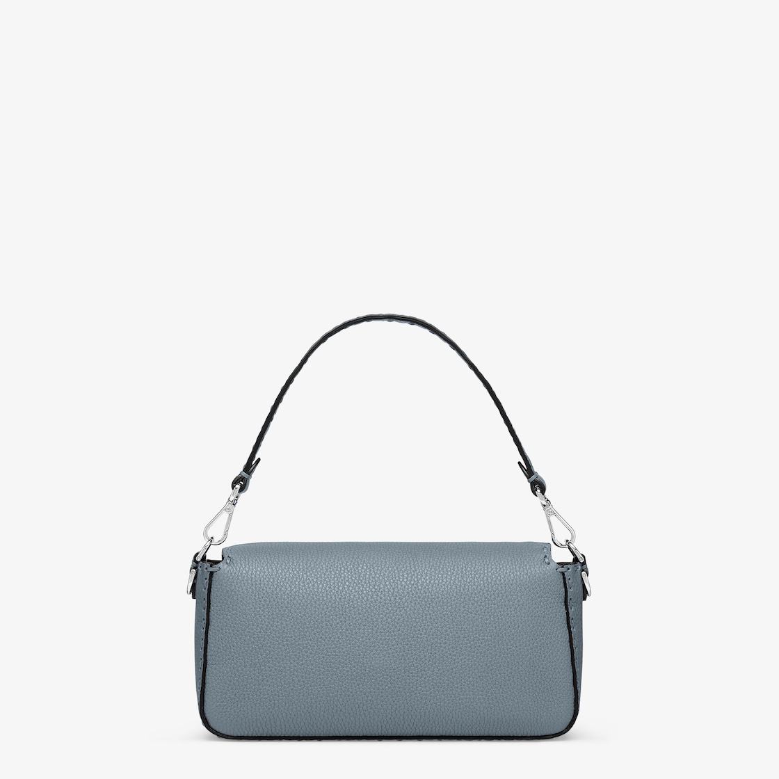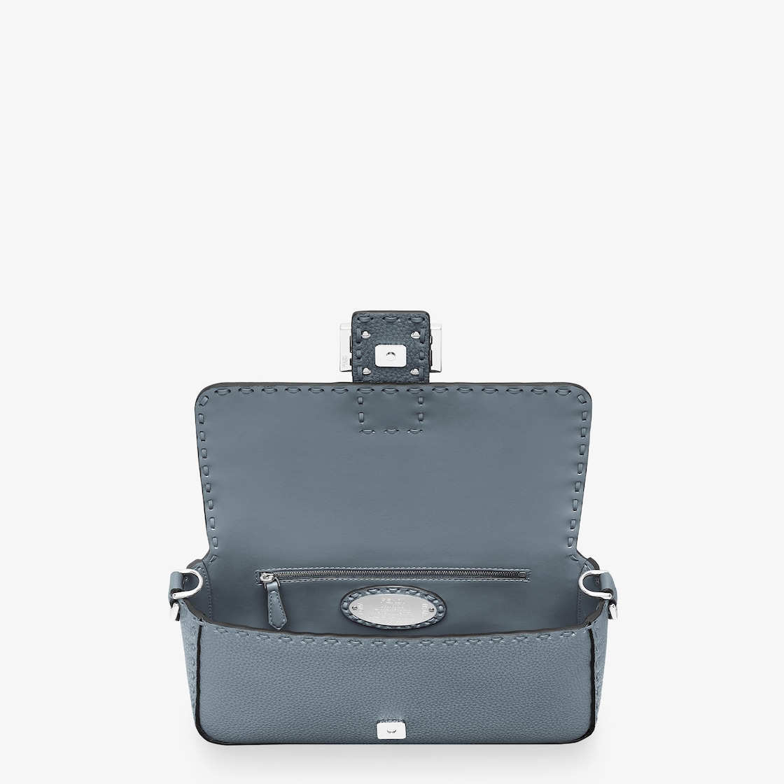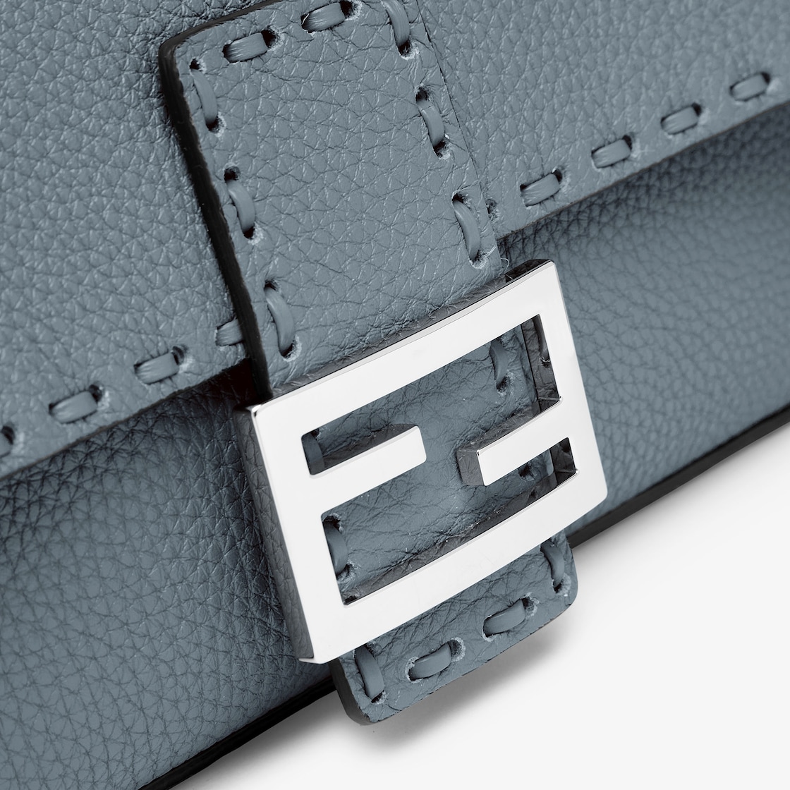 Medium iconic Baguette bag, made with 612 tone-on-tone macro topstitches, an emblem of the iconic Selleria workmanship. Made of blue Cuoio Romano leather, calfskin with a characteristic natural grain, produced with a metal-free tanning process. Featuring a front flap, magnetic clasp, internal calfskin-lined compartment, internal zip pocket, silver Selleria plate, palladium-finish metalware. Decorated with an FF clasp. The bag can be carried by hand or worn on the shoulder thanks to the handle and shoulder strap, both detachable.