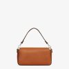 Iconic medium Baguette bag, made of brown Cuoio Romano leather embellished with oversized tone-on-tone hand stitching. Decorated with an FF clasp. Featuring a front flap, magnetic clasp, internal compartment with zip pocket and leather Selleria stamp, and palladium-finish metalware. The bag can be carried by hand, or worn either on the shoulder or cross-body thanks to the handle and shoulder strap, both detachable. Made in Italy