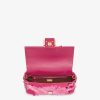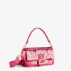 Iconic medium Baguette bag embroidered all-over with fuchsia metallic sequins in different shapes and sizes. Decorated with an FF clasp. Features a front flap, leather details, tone-on-tone bead embroidery and magnetic clasp. Single internal compartment lined in silk with zipper pocket and gold-finish metalware. The bag can be carried by hand, or worn either on the shoulder or cross-body thanks to the handle and shoulder strap, both detachable. Made in Italy