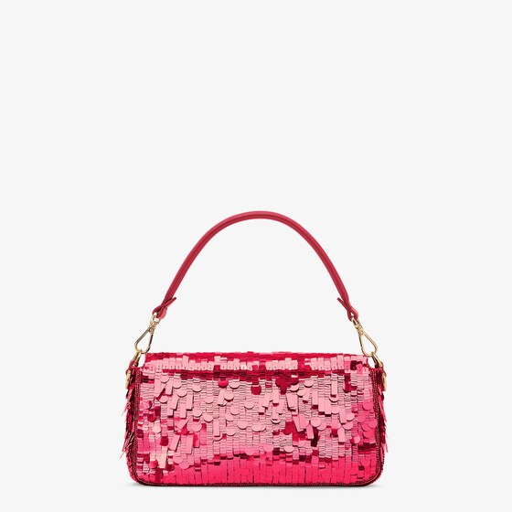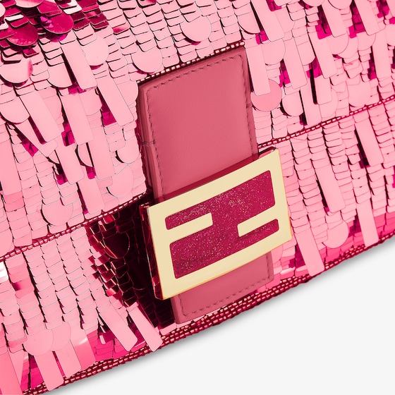 Iconic medium Baguette bag embroidered all-over with fuchsia metallic sequins in different shapes and sizes. Decorated with an FF clasp.