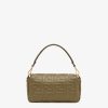 Iconic medium Baguette bag, created in 1997 which went on to become the leading It bag. Versatile and with timeless appeal, it features the iconic underarm design inspired by the French Baguette bread from which it takes its name. Made of soft, green nappa leather with a 3D-effect embossed iconic FF motif and embellished with an FF clasp. Featuring a front flap, magnetic clasp, internal compartment lined in fabric with zip pocket and vintage gold-finish metalware. The bag can be carried by hand, or worn either on the shoulder or cross-body thanks to the handle and shoulder strap, both detachable. Made in Italy