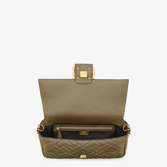 Iconic medium Baguette bag, created in 1997 which went on to become the leading It bag. Versatile and with timeless appeal, it features the iconic underarm design inspired by the French Baguette bread from which it takes its name. Made of soft, green nappa leather with a 3D-effect embossed iconic FF motif and embellished with an FF clasp. Featuring a front flap, magnetic clasp, internal compartment lined in fabric with zip pocket and vintage gold-finish metalware. The bag can be carried by hand, or worn either on the shoulder or cross-body thanks to the handle and shoulder strap, both detachable. Made in Italy
