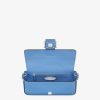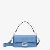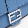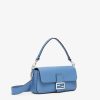 Medium iconic Baguette bag made with 612 hand-sewn tone on tone macro topstitches, an emblem of the iconic Selleria workmanship handed down through generations of Fendi artisans since 1925. Made of light blue Cuoio Romano leather, calfskin with a characteristic natural grain produced with a metal-free tanning process. Featuring a front flap, magnetic clasp, internal calfskin-lined compartment, internal zipper pocket, silver Selleria plate, palladium-finish metalware. Decorated with an FF clasp. The bag can be carried by hand, or worn either on the shoulder or cross-body thanks to the handle and shoulder strap, both detachable. Made in Italy