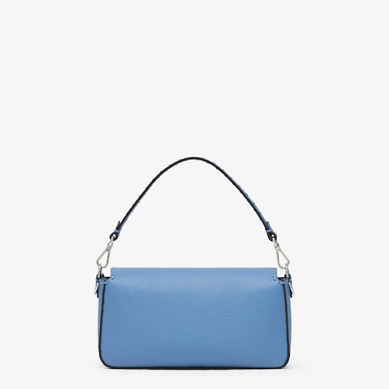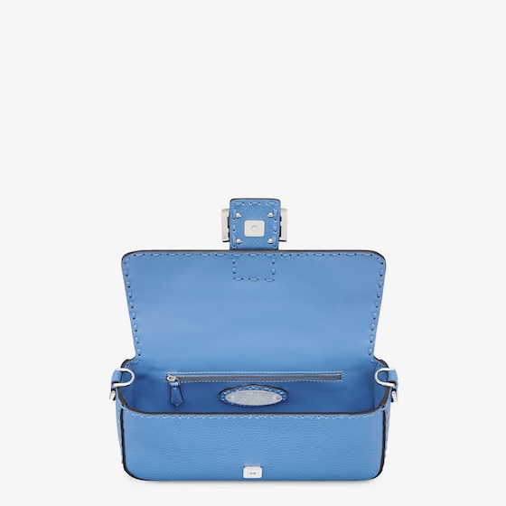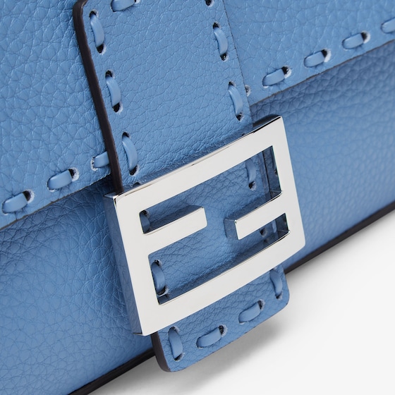 Medium iconic Baguette bag made with 612 hand-sewn tone on tone macro topstitches, an emblem of the iconic Selleria workmanship handed down through generations of Fendi artisans since 1925. Made of light blue Cuoio Romano leather, calfskin with a characteristic natural grain produced with a metal-free tanning process. Featuring a front flap, magnetic clasp, internal calfskin-lined compartment, internal zipper pocket, silver Selleria plate, palladium-finish metalware. Decorated with an FF clasp. The bag can be carried by hand, or worn either on the shoulder or cross-body thanks to the handle and shoulder strap, both detachable. Made in Italy