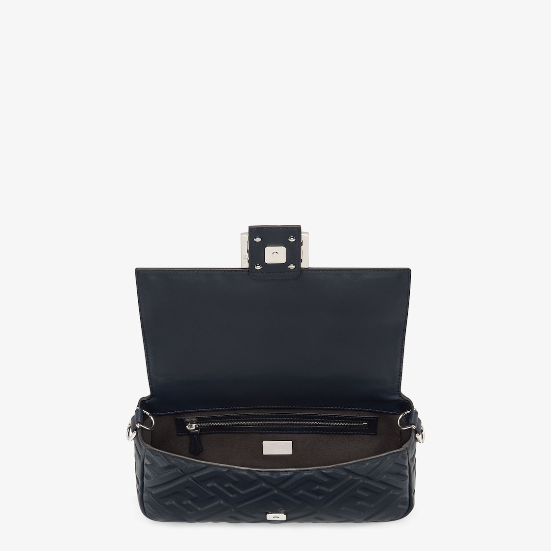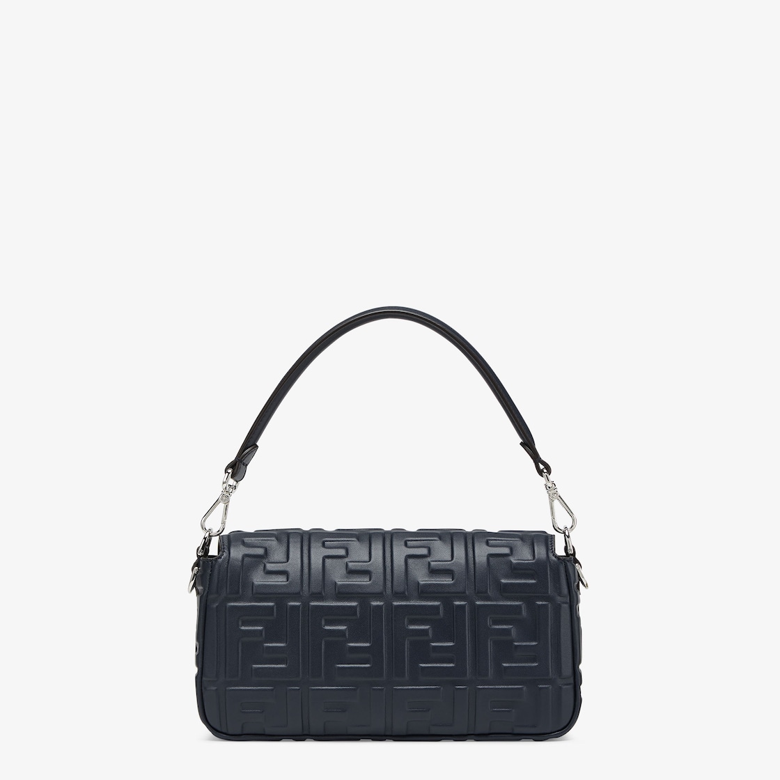 Iconic medium Baguette bag made of midnight blue soft nappa leather with a three-dimensional texture embossed FF motif. Decorated with an FF clasp. Featuring a front flap, magnetic clasp, a single internal compartment with zipper pocket and palladium-finish metalware. The bag can be carried by hand, or worn either on the shoulder or cross-body thanks to the handle and shoulder strap, both detachable.