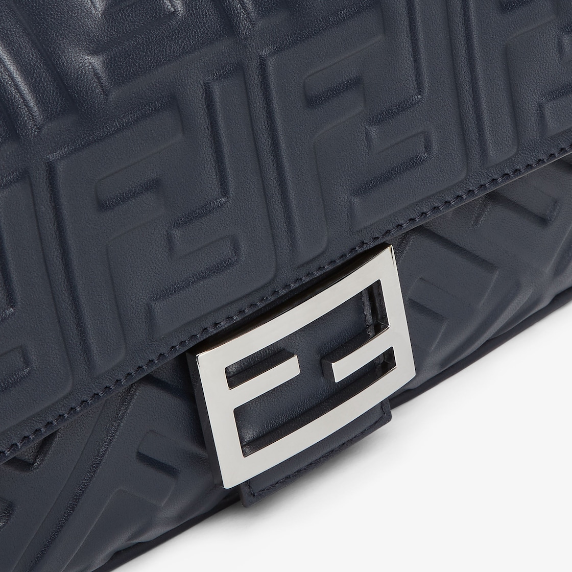 Iconic medium Baguette bag made of midnight blue soft nappa leather with a three-dimensional texture embossed FF motif. Decorated with an FF clasp.