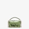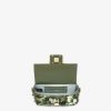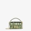 Iconic small Baguette bag hand-embroidered with green sequins of different shapes and sizes. Trimmed in green calfskin and embellished with an FF clasp. Featuring a front flap, magnetic clasp, brown satin-lined internal compartment with a leather pocket and gold-finish metalware. The bag can be carried by hand, or worn either on the shoulder or cross-body thanks to the handle and chain shoulder strap, both detachable. Holds a 6.7-inch smartphone, Mini Trifold card holder or wallet, keys and lipstick. Made in Italy