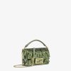 Iconic small Baguette bag hand-embroidered with green sequins of different shapes and sizes. Trimmed in green calfskin and embellished with an FF clasp.