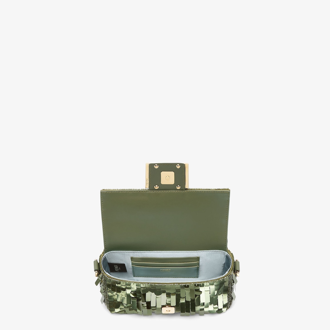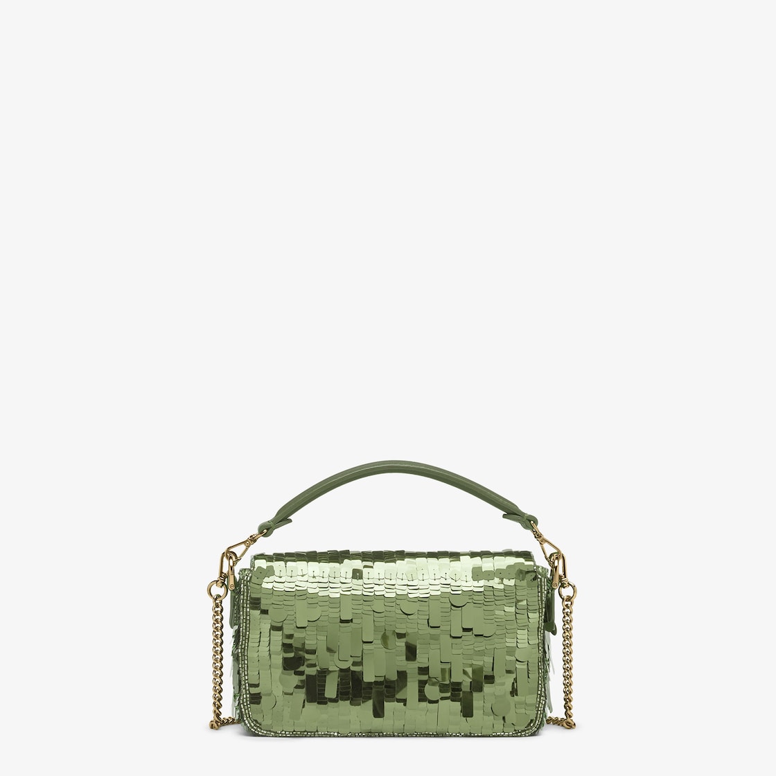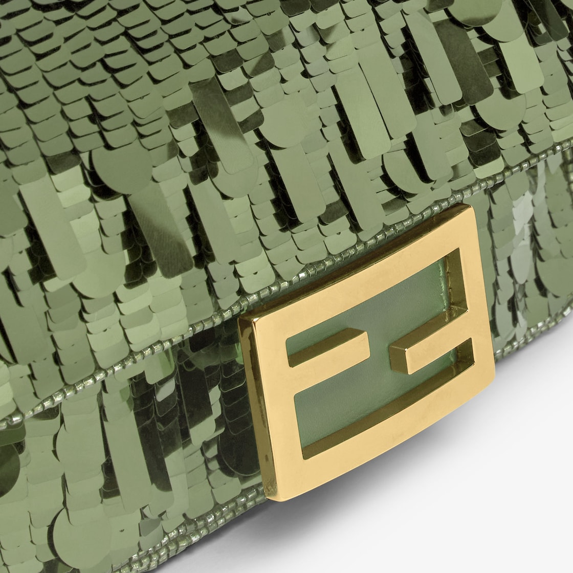 Iconic small Baguette bag hand-embroidered with green sequins of different shapes and sizes. Trimmed in green calfskin and embellished with an FF clasp.