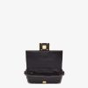 Small iconic Baguette bag made of soft, black nappa leather with a 3D-effect embossed iconic FF motif and embellished with an FF clasp. Features a front flap, magnetic clasp, fabric-lined internal compartment with a pocket and gold-finish metalware. The bag can be carried by hand, or worn either on the shoulder or cross-body thanks to the handle and chain shoulder strap, both detachable. Holds a 6.7-inch smartphone, Mini Trifold card holder or wallet, keys and lipstick.