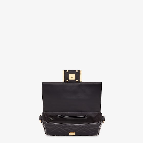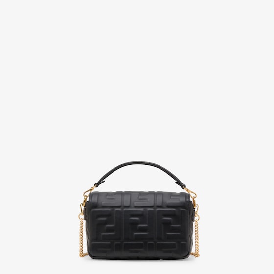 Small iconic Baguette bag made of soft, black nappa leather with a 3D-effect embossed iconic FF motif and embellished with an FF clasp. Features a front flap, magnetic clasp, fabric-lined internal compartment with a pocket and gold-finish metalware. The bag can be carried by hand, or worn either on the shoulder or cross-body thanks to the handle and chain shoulder strap, both detachable. Holds a 6.7-inch smartphone, Mini Trifold card holder or wallet, keys and lipstick.