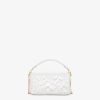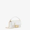 Iconic mini Baguette bag embroidered all-over with white metallic sequins in different shapes and sizes. Decorated with an FF clasp. Features a front flap, leather details, tone-on-tone bead embroidery and magnetic clasp. Single internal compartment lined in silk with a pocket and gold-finish metalware. The bag can be carried by hand, or worn either on the shoulder or cross-body thanks to the handle and shoulder strap, both detachable. Made in Italy