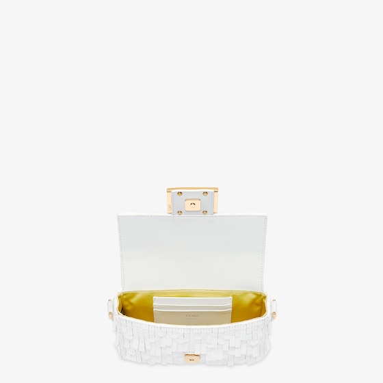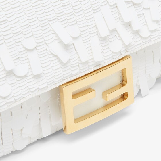 Iconic mini Baguette bag embroidered all-over with white metallic sequins in different shapes and sizes. Decorated with an FF clasp. Features a front flap, leather details, tone-on-tone bead embroidery and magnetic clasp. Single internal compartment lined in silk with a pocket and gold-finish metalware. The bag can be carried by hand, or worn either on the shoulder or cross-body thanks to the handle and shoulder strap, both detachable. Made in Italy
