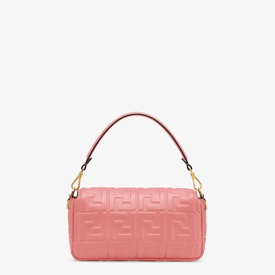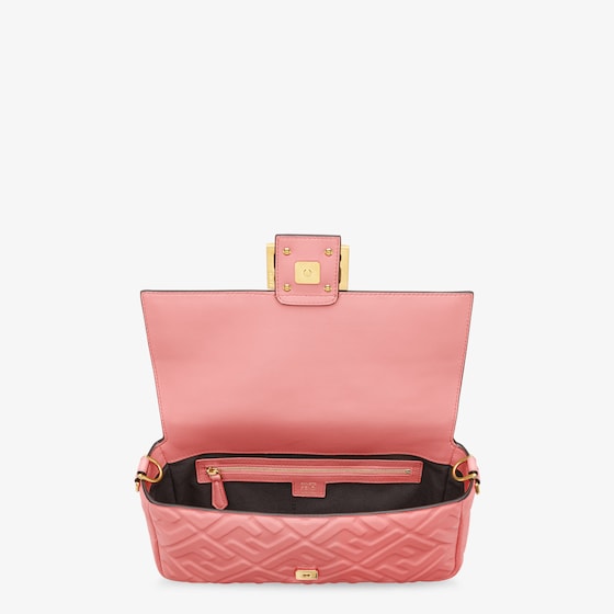 Iconic medium Baguette bag, created in 1997 which went on to become the leading It bag. Versatile and with timeless appeal, it features the iconic underarm design inspired by the French Baguette bread from which it takes its name. Made of soft, pink nappa leather with a 3D-effect embossed iconic FF motif and embellished with an FF clasp. Featuring a front flap, magnetic clasp, internal compartment lined with fabric and with a zip pocket and gold-finish metalware. The bag can be carried by hand, or worn either on the shoulder or cross-body thanks to the handle and shoulder strap, both detachable