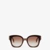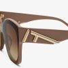 Square Fendi First eyeglasses in taupe acetate. Temples with oversize diagonal F motif in gold-colored metal. Brown gradient lenses.