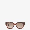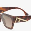 Rectangular Fendi First eyeglasses in Havana acetate. Temples with oversize diagonal F motif in gold-colored metal. Brown gradient lenses.