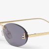 Oval Fendi First Crystal glasses with a gold-colored rimless metal structure. Blue lenses embellished with micro F in crystals. Adjustable nose pads. Made in Italy