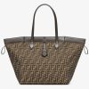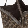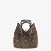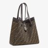 Large Origami bag made of fabric with jacquard FF motif. The style recalls the creativity and dual nature of Fendi with an innovative design that can be transformed. Thanks to eight concealed magnets the bag can be styled as a shopper bag or bucket bag by folding it origami style. It comes with a key case charm with the word Fendi in metal and dark brown leather details. Lined inner compartment and gold-finish metalware. It can be carried by hand or worn on the shoulder thanks to 2 leather handles.