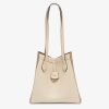 Medium Origami Bag. The style recalls the duality and creativity of Fendi with an innovative and transformable design: the ingenious closure with eight magnets means the bag can be folded, origami-style, transforming it from a bucket bag, when the magnets come together in the middle with a magic clasp, into a shopper by gently pulling the leather ties on the short shoulder straps on each side. Made of light beige two-tone leather with dark beige sides. It comes with a key case charm with the words “Fendi Roma” in metal. Lined inner compartment and gold-finish metalware. It can be carried by hand or worn on the shoulder thanks to two leather handles.