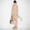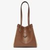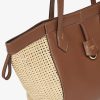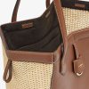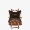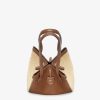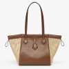 Medium Origami Bag. The style recalls the duality and creativity of Fendi with an innovative and transformable design: the ingenious closure with eight magnets means the bag can be folded, origami-style, transforming it from a bucket bag, when the magnets come together in the middle with a magic clasp, into a shopper by gently pulling the leather ties on the short shoulder straps on each side. Made of brown leather with natural-coloured macramé sides. It comes with a key case charm with the words “Fendi Roma” in metal. Lined inner compartment and gold-finish metalware. It can be carried by hand or worn on the shoulder thanks to two brown leather handles.