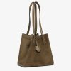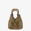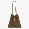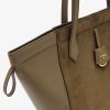 Medium Origami Bag. The style recalls the duality and creativity of Fendi with an innovative and transformable design: the ingenious closure with eight magnets means the bag can be folded, origami-style, transforming it from a bucket bag, when the magnets come together in the middle with a magic clasp, into a shopper by gently pulling the leather ties on the short shoulder straps on each side. Made of green suede with sides in tone-on-tone calfskin. It comes with a key case charm with the words “Fendi Roma” in metal. Lined inner compartment and gold-finish metalware. It can be carried by hand or worn on the shoulder thanks to two leather handles.