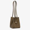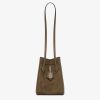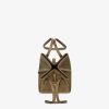 Mini Origami Bag. The style recalls the duality and creativity of Fendi with an innovative and transformable design: the ingenious closure with eight magnets means the bag can be folded, origami-style, transforming it from a bucket bag, when the magnets come together in the middle with a magic clasp, into a shopper by gently pulling the leather ties on the short shoulder straps on each side. Made of green suede with sides in tone-on-tone calfskin. It comes with a key case charm with the words “Fendi Roma” in metal. Lined inner compartment and gold-finish metalware. It can be carried by hand or worn on the shoulder thanks to the two calfskin handles.