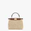 Iconic small Peekaboo bag, the epitome of Fendi craftsmanship and creativity. A timeless icon, the Peekaboo was created in 2009. Like the children’s game it takes its name from, peek-a-boo, the bag plays with the beauty showcased on the outside and that concealed on the inside. Made of natural-colored macramé and trimmed with brown calfskin. Featuring an unlined interior, two internal compartments divided by a stiff brown nappa-leather partition, internal pocket. Gold-finish bar, closure and metalware. Decorated with the iconic twist lock on both sides. The bag can be carried by hand or worn either on the shoulder or crossbody thanks to the handle and adjustable, detachable shoulder strap. 8BN244AOVPF1PII