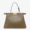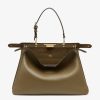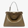 • Iconic Large Peekaboo Soft bag, the epitome of Fendi craftsmanship and creativity. A timeless icon, the Peekaboo was created in 2009. Like the children’s game it takes its name from, peek-a-boo, the bag plays with the beauty showcased on the outside and that concealed on the inside. Presented at the Fall-Winter 2024/25 fashion show, it features a soft look that enhances the bag’s “smile” on the front panel. Made of green calfskin with a silky finish. Featuring a suede-lined interior with two internal compartments divided by a stiff partition and a leather internal pocket with gold-coloured FENDI logo print. Leather covered aluminium bar to lighten the weight of the bag, gold-finish clasp and metalware. Decorated with the iconic twist lock on both sides. It can be carried on the shoulder or by hand thanks to the adjustable handle.