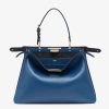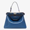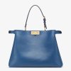 • Iconic Large Peekaboo Soft bag, the epitome of Fendi craftsmanship and creativity. A timeless icon, the Peekaboo was created in 2009. Like the children’s game it takes its name from, peek-a-boo, the bag plays with the beauty showcased on the outside and that concealed on the inside. Presented at the Fall-Winter 2024/25 fashion show, it features a soft look that enhances the bag’s “smile” on the front panel. Made of blue calfskin with a silky finish. Featuring a suede-lined interior with two internal compartments divided by a stiff partition and a leather internal pocket with gold-coloured FENDI logo print. Leather covered aluminium bar to lighten the weight of the bag, gold-finish clasp and metalware. Decorated with the iconic twist lock on both sides. It can be carried on the shoulder or by hand thanks to the adjustable handle.
