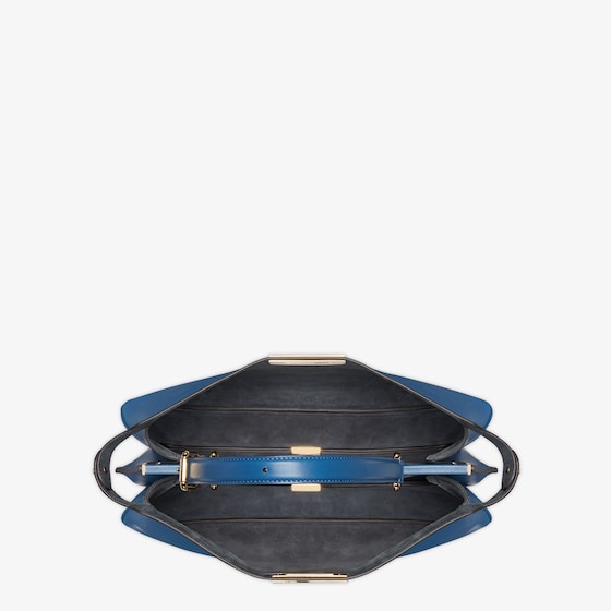 • Iconic Large Peekaboo Soft bag, the epitome of Fendi craftsmanship and creativity. A timeless icon, the Peekaboo was created in 2009. Like the children’s game it takes its name from, peek-a-boo, the bag plays with the beauty showcased on the outside and that concealed on the inside. Presented at the Fall-Winter 2024/25 fashion show, it features a soft look that enhances the bag’s “smile” on the front panel. Made of blue calfskin with a silky finish. Featuring a suede-lined interior with two internal compartments divided by a stiff partition and a leather internal pocket with gold-coloured FENDI logo print. Leather covered aluminium bar to lighten the weight of the bag, gold-finish clasp and metalware. Decorated with the iconic twist lock on both sides. It can be carried on the shoulder or by hand thanks to the adjustable handle.
