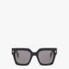 Oversize square Fendi Roma sunglasses made of black acetate. Temples with visible metal core with laser etched FF. Gold finish Fendi Roma logo on the sides. Gray lenses. Made in Italy