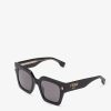 Oversize square Fendi Roma sunglasses made of black acetate. Temples with visible metal core with laser etched FF. Gold finish Fendi Roma logo on the sides. Gray lenses.