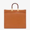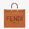 Sunshine shopper made of brown leather with heat-stamped “FENDI ROMA” motif.